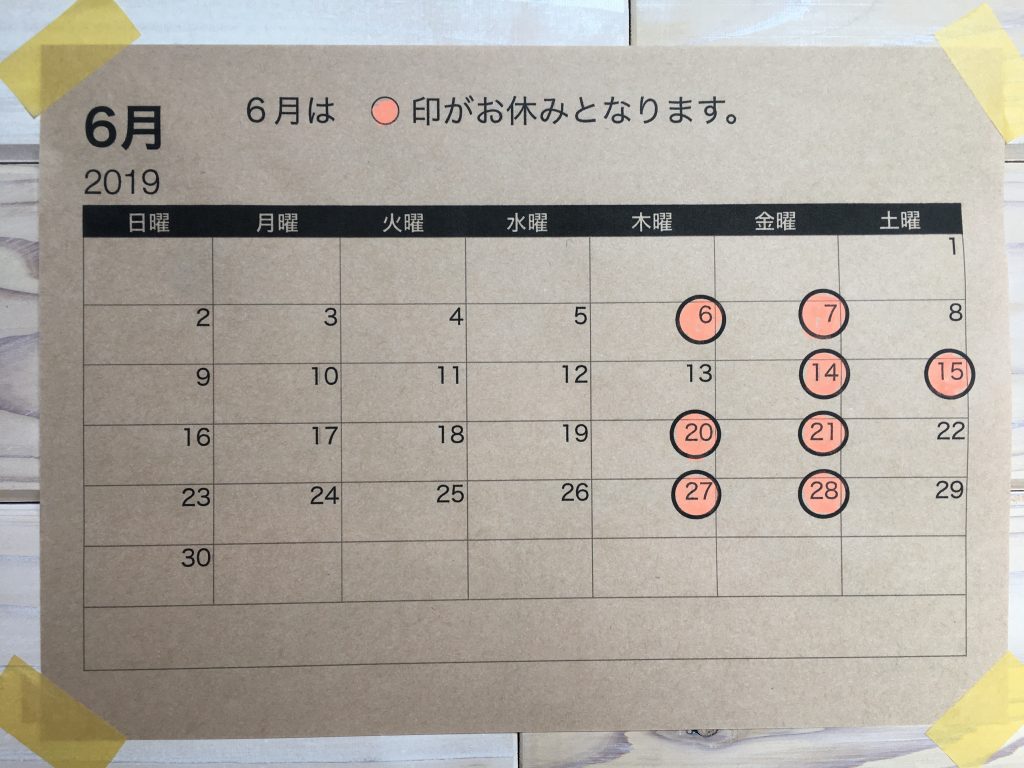 投稿日: 2019年5月29日2019年6月30日 投稿者: Chikako6月の定休日 お休みは2週目だけ14日15日の(金) (土)となります。ほかは(木)(金)をお休みとさせて頂きます。宜しくお願い致します。