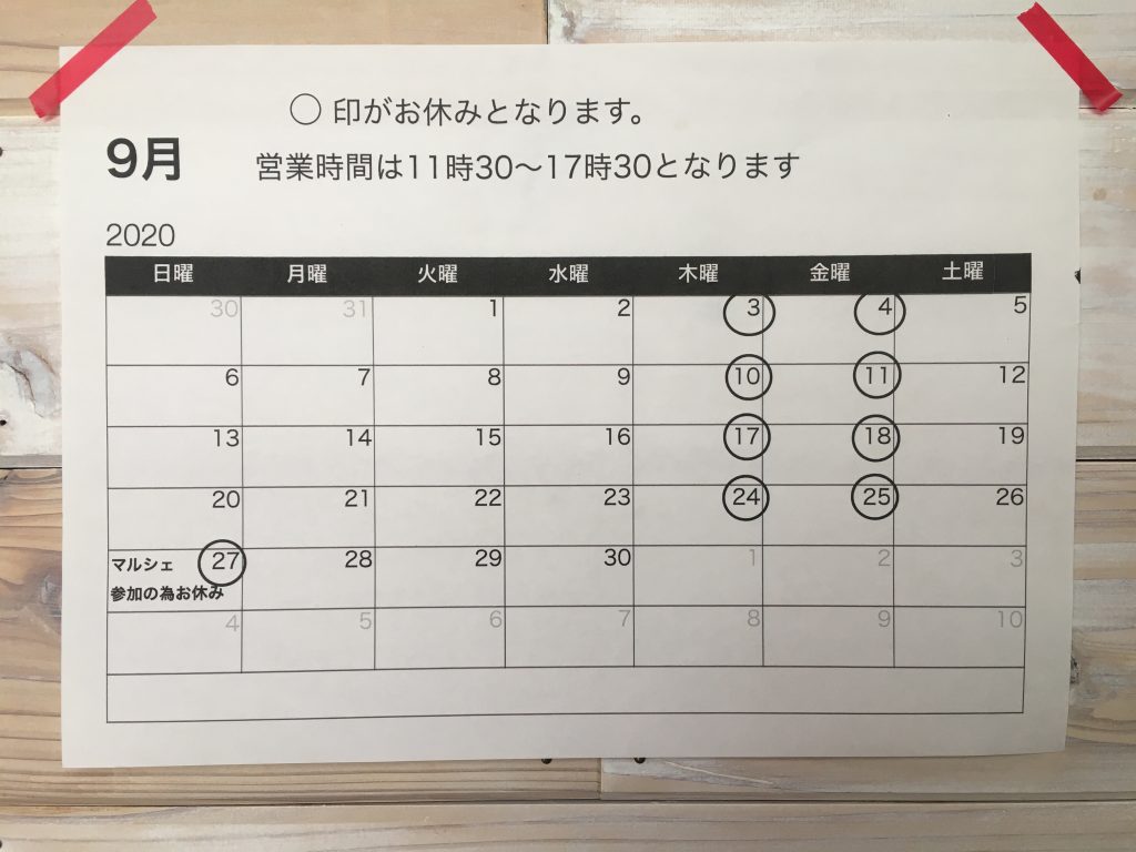 9月の営業のお知らせ