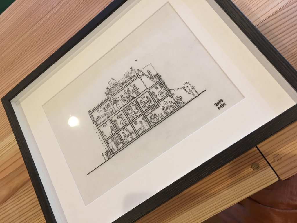 投稿日: 2018年6月25日2018年7月14日 投稿者: Chikakoカフェをつくる 「きっとチカコさんはこんな風に、住んで居る人・暮らし方・自然エネルギーとか・・・都会でも暮らしや人との循環させたいんだよね?」と設計士のコウさんが可愛いイラストをサプライズで描いてくれていました。 オープンのお祝いにとその原画を額に入れてくれ、こちらは店内で飾らせていただこうかなと思います。