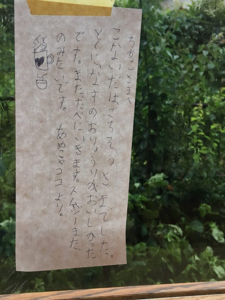 投稿日: 2018年7月29日2018年10月5日 投稿者: Chikakoかわいいお客様たち 親子で来てくださるお客様。楽しそうに子供たちが笑う声に空気が和みます。美味しかったとお手紙をくださったり、「あげるー!」と言ってたくさん折紙を折ってくれたり。お店のお菓子は乳製品、精製された砂糖は使用していません。お子様も安心して召しあがって頂けるので、気軽に立ち寄ってくださる方が徐々に増えてくれたらと思います。