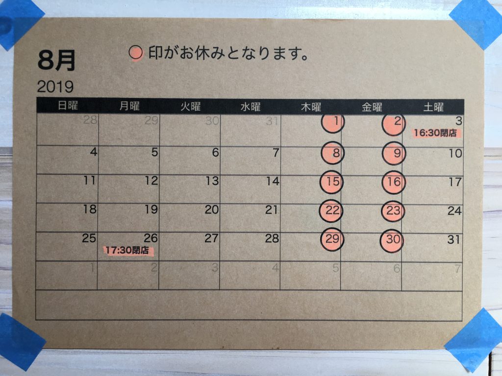 投稿日: 2019年7月31日2019年7月31日 投稿者: Chikako8月の定休日 毎週、木曜と金曜をお休みとさせて頂きます。3日(土)は16時30まで、26(月)は17時30まで、と通常と閉店時間が異なります。よろしくお願いします。