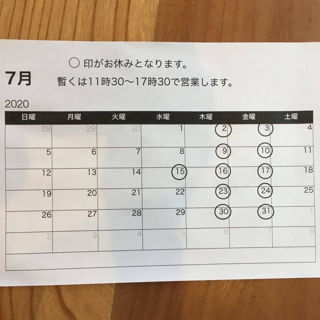 投稿日: 2020年7月5日2020年8月1日 投稿者: Chikako7月の定休日 まだ不安定な状況の東京風が抜ける店内、お客様の入店時の消毒や手洗の習慣などによりお陰さまで無事に6月を終えました。応援のお言葉を下さる方、ご来店の皆さまありがとうございます。引き続き11時30~17時30営業です。こちらの都合で連休を頂きます。よろしくお願いいたします。