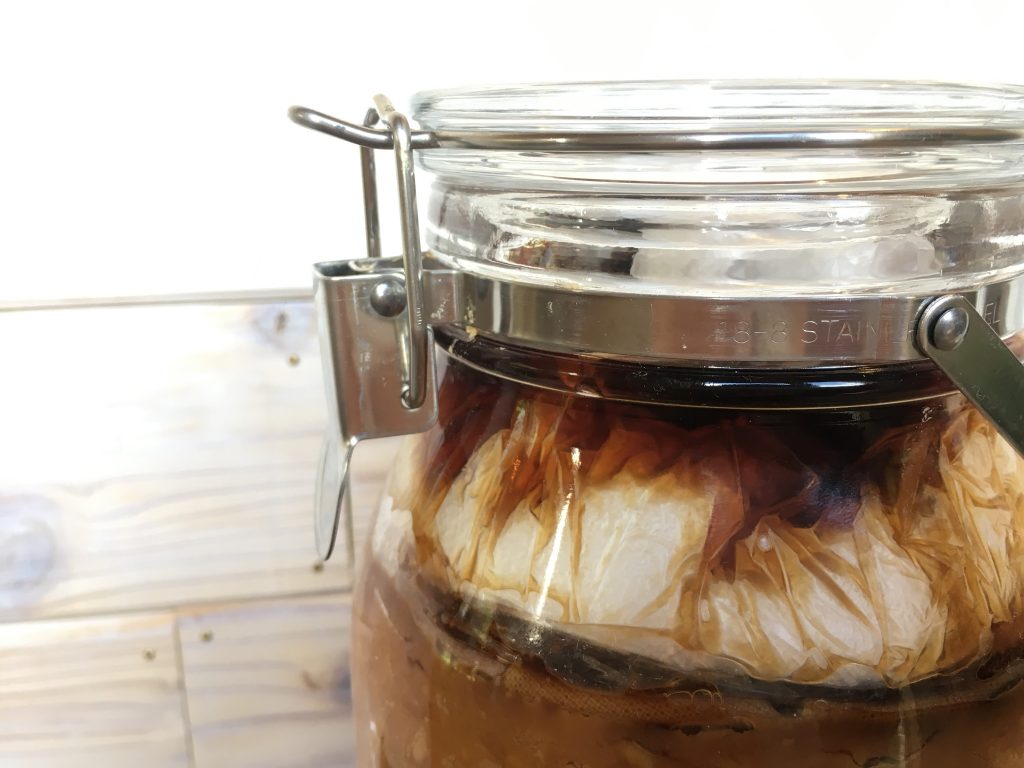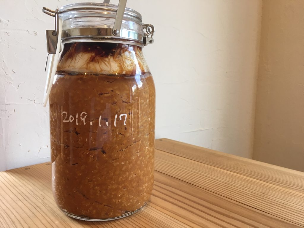 投稿日: 2019年8月5日2019年8月5日 投稿者: Chikako手前味噌の経過 1月と2月の味噌づくりワークショップにご参加いただきました皆さまの味噌が気になる今日この頃・・・夏らしい暑さをむかえた辺りから、徐々に重石の周りに液体が上がりはじめています。 これは「たまり」です!少量しかとれず貴重なもの。 手前味噌の場合、みそに混ぜ込んでもよいですが味的には醤油に近いので、単独で使う方がそれぞれに楽しめる!うま味たっぷりで濃厚な「たまり」を楽しみたいと思います。 夏を越し1年近く寝かすと、味噌は冬に向かうときに気温が下がると共に味見と香りがのってくると言われています。いま味わうと、それよりさっぱりした感じでしょう。もうちょい先まで待ってみるのも良し、いま味わうのも良し。ふとしたタイミングで開封して楽しみましょう!