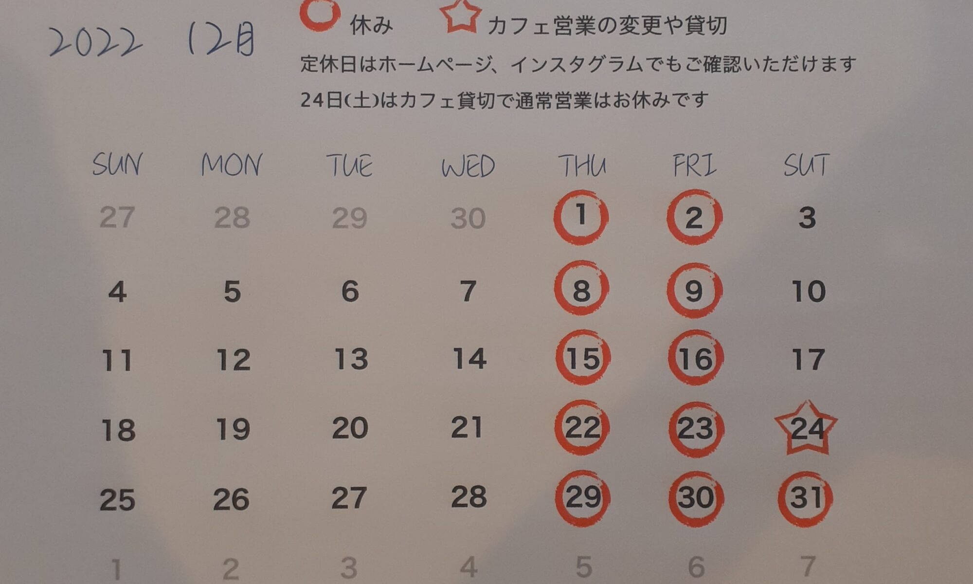 今年も最後の月となりましたね24日はカフェ貸切のご依頼で通常営業はお休みとなります今月も宜しくお願いいたします ... 続きを読む