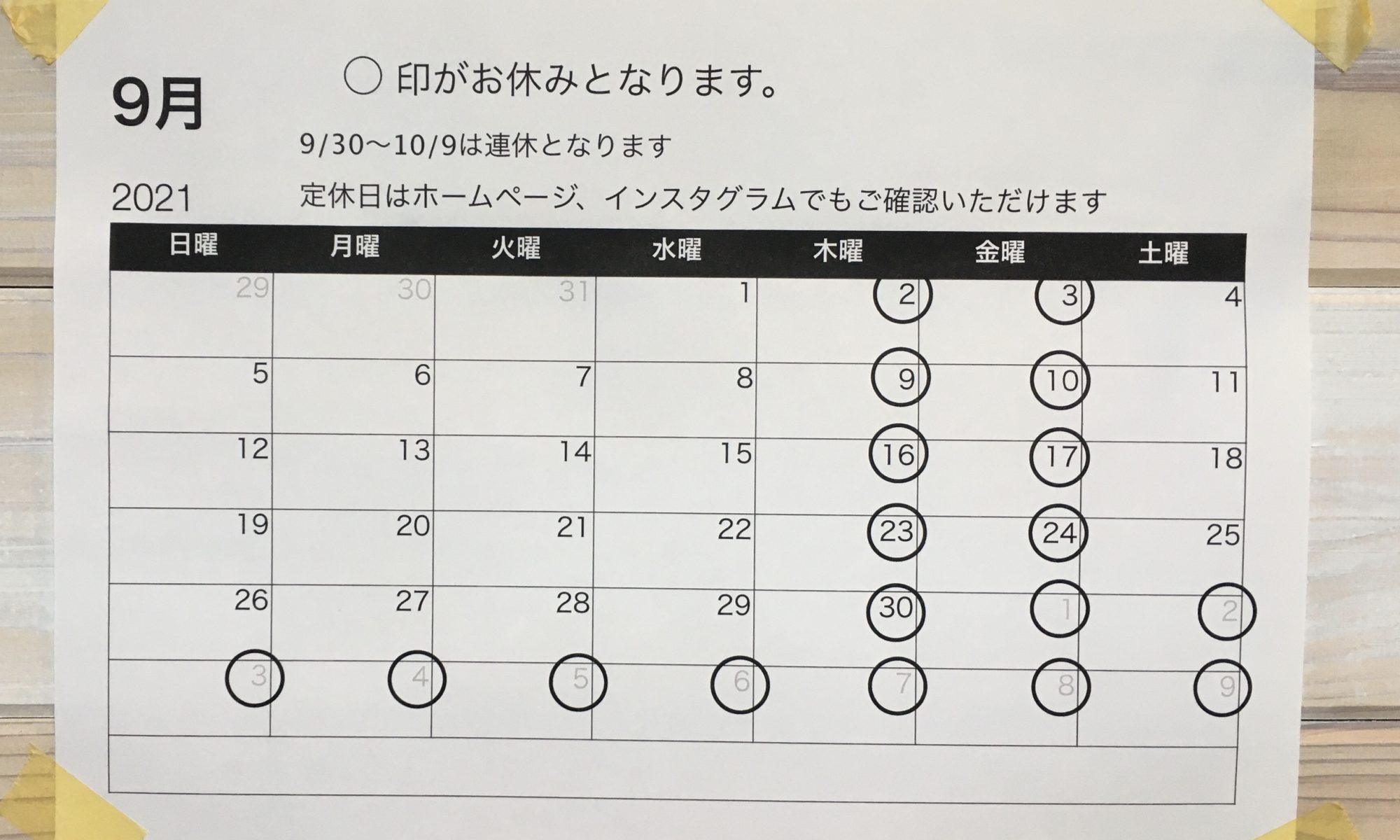 9月の営業のお知らせ