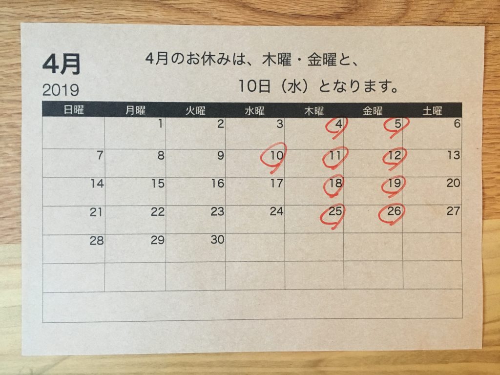 投稿日: 2019年3月26日2019年3月26日 投稿者: Chikako4月の定休日 木曜と金曜の定休日以外に、10日(水)もお休みとさせて頂きます。ご不便お掛け致しますが、よろしくお願い致します。