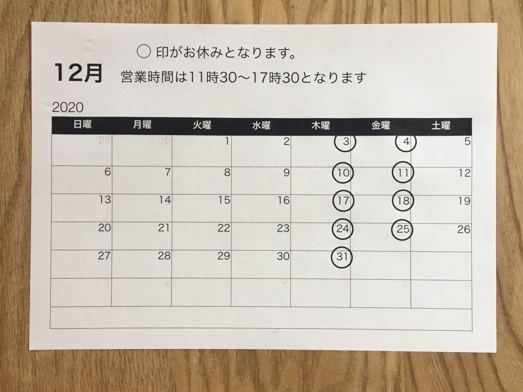 投稿日: 2020年12月4日2021年2月1日 投稿者: Chikako12月の定休日 年末や年始は食材の状況でメニューは通常通りではなくシンプルになるかも知れません アンキミカでほっと一息、ついて頂ければ幸いです 今月も宜しくお願いします