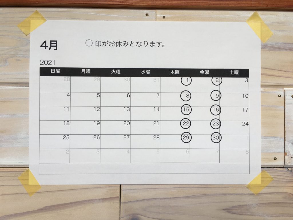 投稿日: 2021年3月30日2021年3月30日 投稿者: Chikako4月の定休日 3月最終日の水曜も含めて月初めカフェはお休み 三連休となります進学、就職、異動、学生から社会人へ進む方そうでない方も新たな気持ちになる季節へ4月もよろしくお願いします