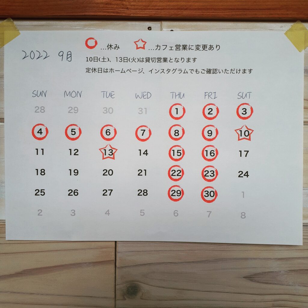 投稿日: 2022年8月28日2022年8月28日 投稿者: Chikako9月営業のお知らせ 夜になく虫の声や朝日の差込む感じに夏が去りつつあるなぁ〜と感じるこの数日です来月は店内の掃除も兼ねて前半にしばしお休みを頂きますまた10日(土)、13日(火)は貸切営業のため通常カフェはございませんいろいろご不便お掛け致しますが宜しくお願いいたします