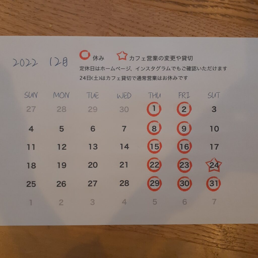 投稿日: 2022年12月2日2022年12月2日 投稿者: Chikako12月営業のお知らせ 今年も最後の月となりましたね24日はカフェ貸切のご依頼で通常営業はお休みとなります今月も宜しくお願いいたします