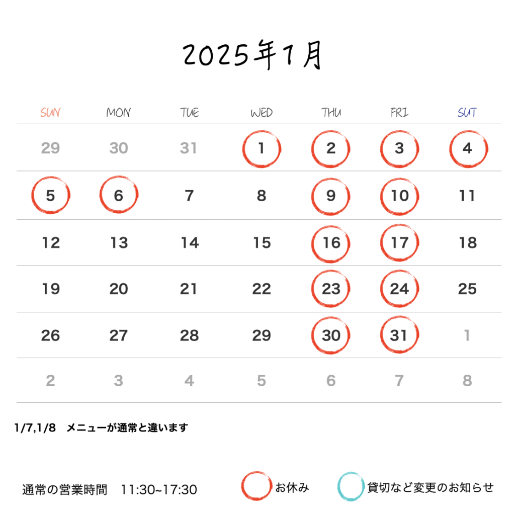 投稿日: 2024年12月31日2024年12月31日 投稿者: Chikako1月営業のお知らせ 皆様にとって良い新年が始まりますよう願っています来年も不定期な営業になることもありますがカレンダーをチェック頂きご来店いただければ嬉しいです1/7.1/8は通常メニューと違うメニューとなります来年もどうぞよろしくお願いいたします!