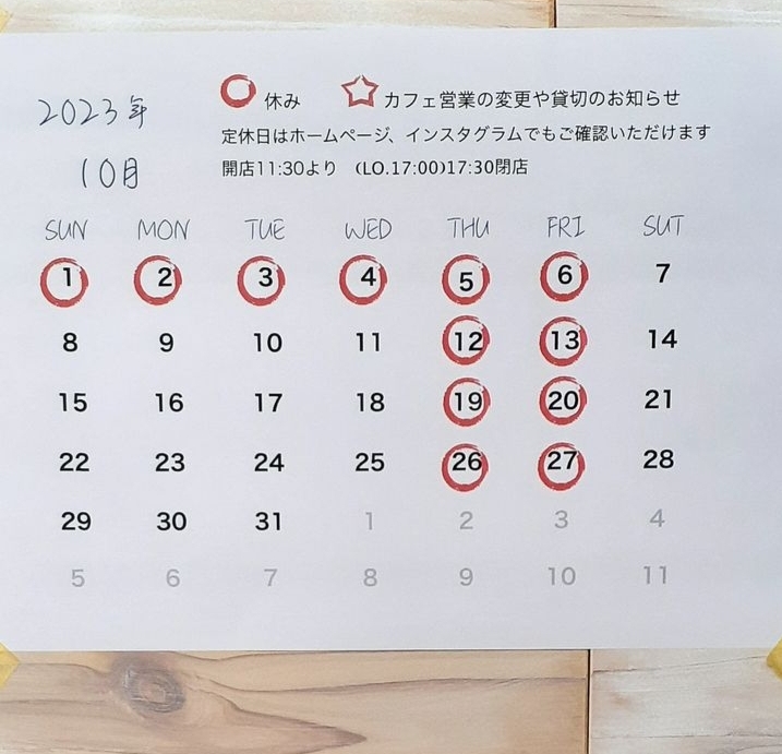 投稿日: 2023年9月30日2023年9月30日 投稿者: Chikako10月営業のお知らせ 暑さがずっと長引いて季節のうつろいをゆっくりと感じられないままで体のリズムのとりずらさを感じます 皆さまはいかがですか?もう秋なのですよね、、、今年も3ヶ月しかない感覚全くわかないです 月のはじめ10/6(金)まで連休となります 来月もよろしくお願いします