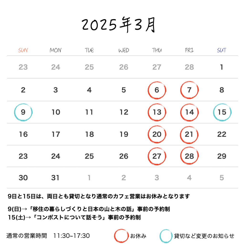 3月は9日と15日が貸切のため通常営業はお休みとなります