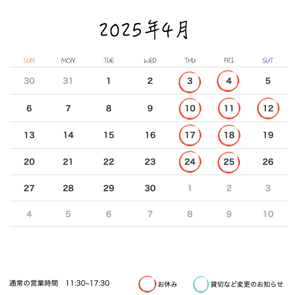 投稿日: 2025年4月1日2025年4月1日 投稿者: Chikako4月営業のお知らせ 桜が開いたと思ったら寒い日や雨の日が続きますねどうぞ温かくしてお過ごしください土曜日も一日お休みをいただきます今月もよろしくお願い致します