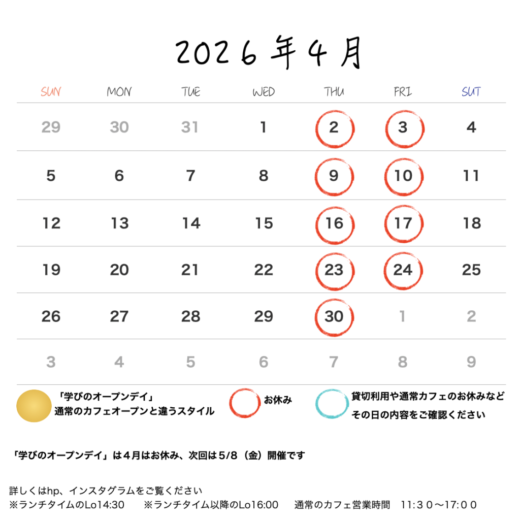 投稿日: 2026年4月2日2026年4月2日 投稿者: Chikako4月営業のお知らせ 4月のカレンダーの投稿が遅くなりました学びのオープンデイ(金継ぎクラス)は今月はお休みになります来月より金継ぎは年内日程がすでに決まっております5月8日、6月5日、7月3日、8月7日、9月4日、10月2日、11月6日、12月4日講師の圖子愛子先生による本漆・純金をはじめすべて自然の材料を使用した日本古来の手法による金継ぎが学べますのでご興味ありましたらhpより詳細をご確認くださいませ